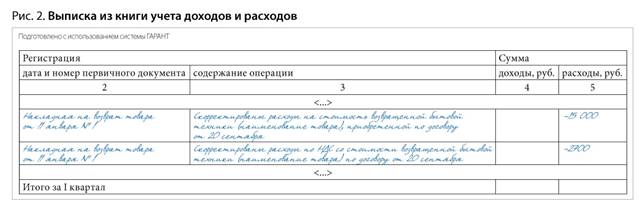 Используем данные предыдущего примера. Допустим, брак товара был обнаружен покупателем в январе следующего года. Книга учета доходов и расходов компании «Омега» при возврате будет выглядеть следующим образом (см. рис. 2).